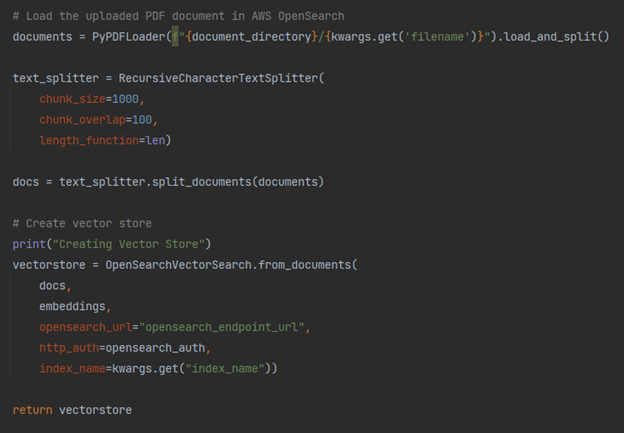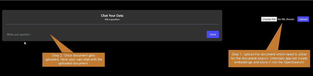 Add the capability to upload documents to the Amazon OpenSearch vector store using Bedrock Embeddings. For a comprehensive understanding of Amazon OpenSearch’s capabilities and features, please refer to this link. The screenshot below demonstrates the document upload process: