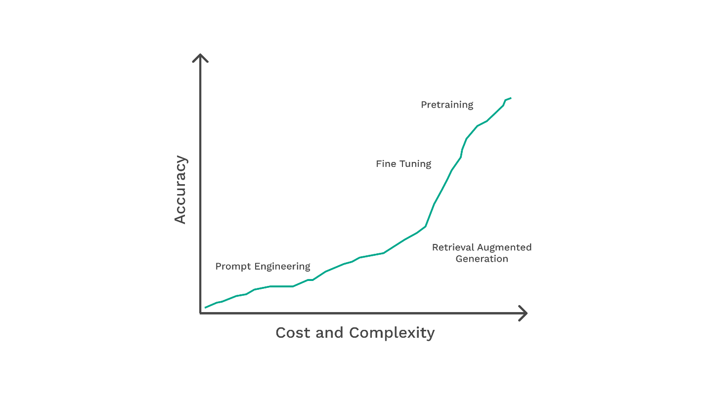 Techniques like Retrieval Augmented Generation (RAG), Model Fine-tuning, and Model Pertaining can be leveraged for further accuracy. However, these advanced methods come with additional costs and complexity, as illustrated in the graph below: