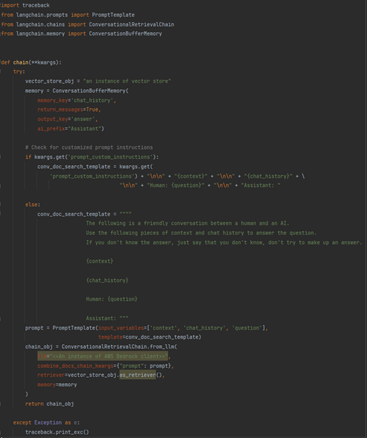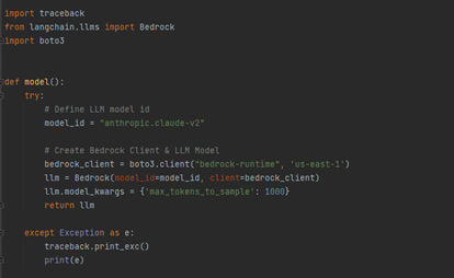 In this step, need to specify the functional model that you want to use. As mentioned earlier, we have leveraged Anthropic’ s Claude FM. The snapshot below details how to create the Amazon Bedrock client: