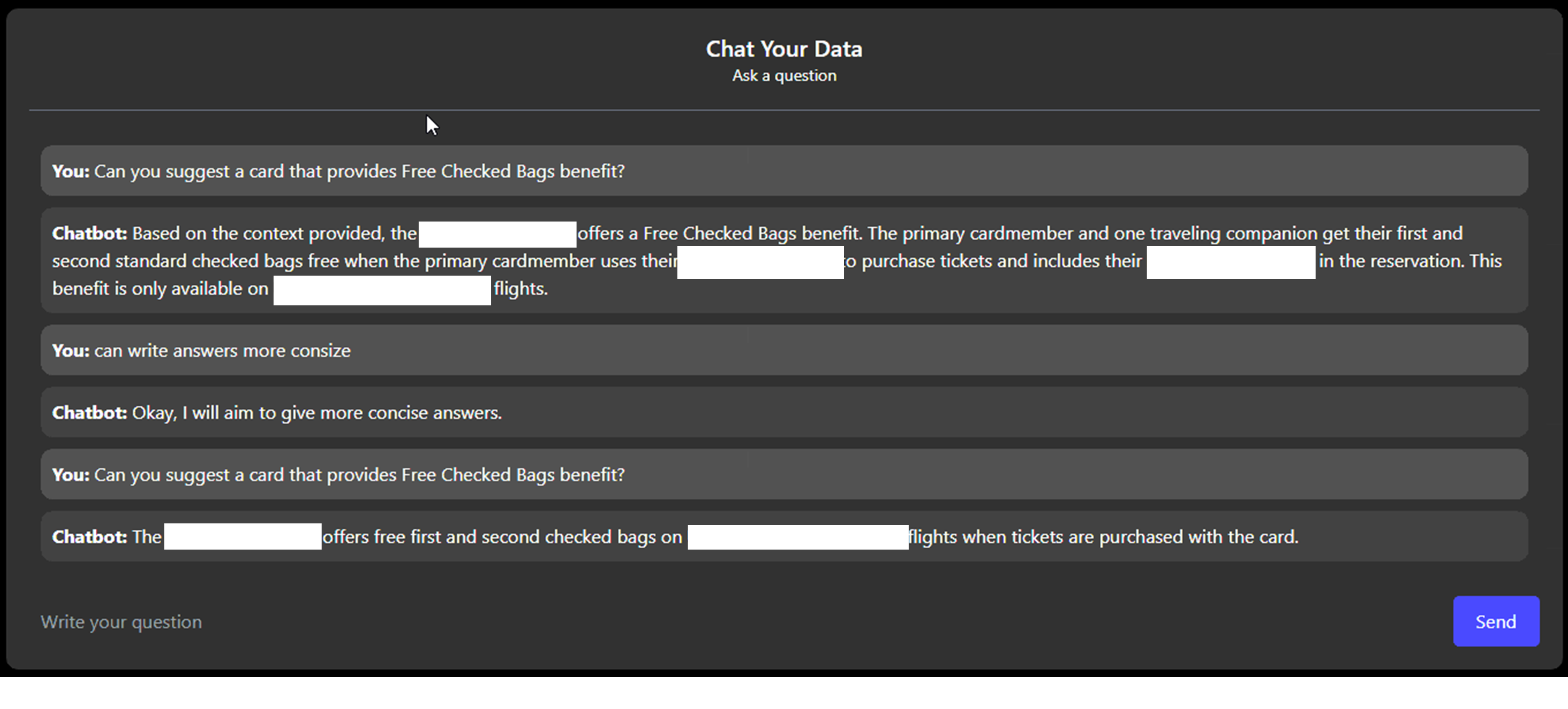 Based on the response, customers can make informed choices tailored to their needs. Additionally, it functions as both a recommendation and Q&A-based application, allowing users to seek card recommendations based on their preferences. The system offers the flexibility to request concise responses by utilizing simple prompts.